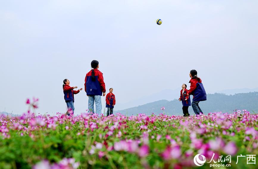 孩子们在紫云英花海打排球。