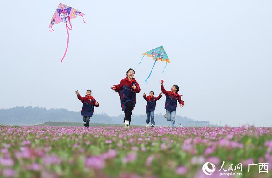 孩子们在紫云英花海放纸鸢。