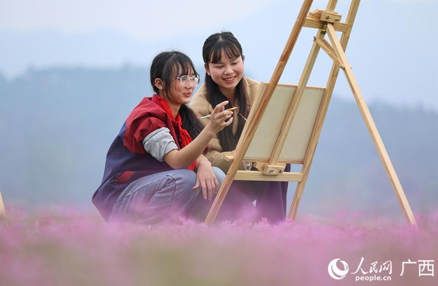 孩子们在紫云英花海绘画。